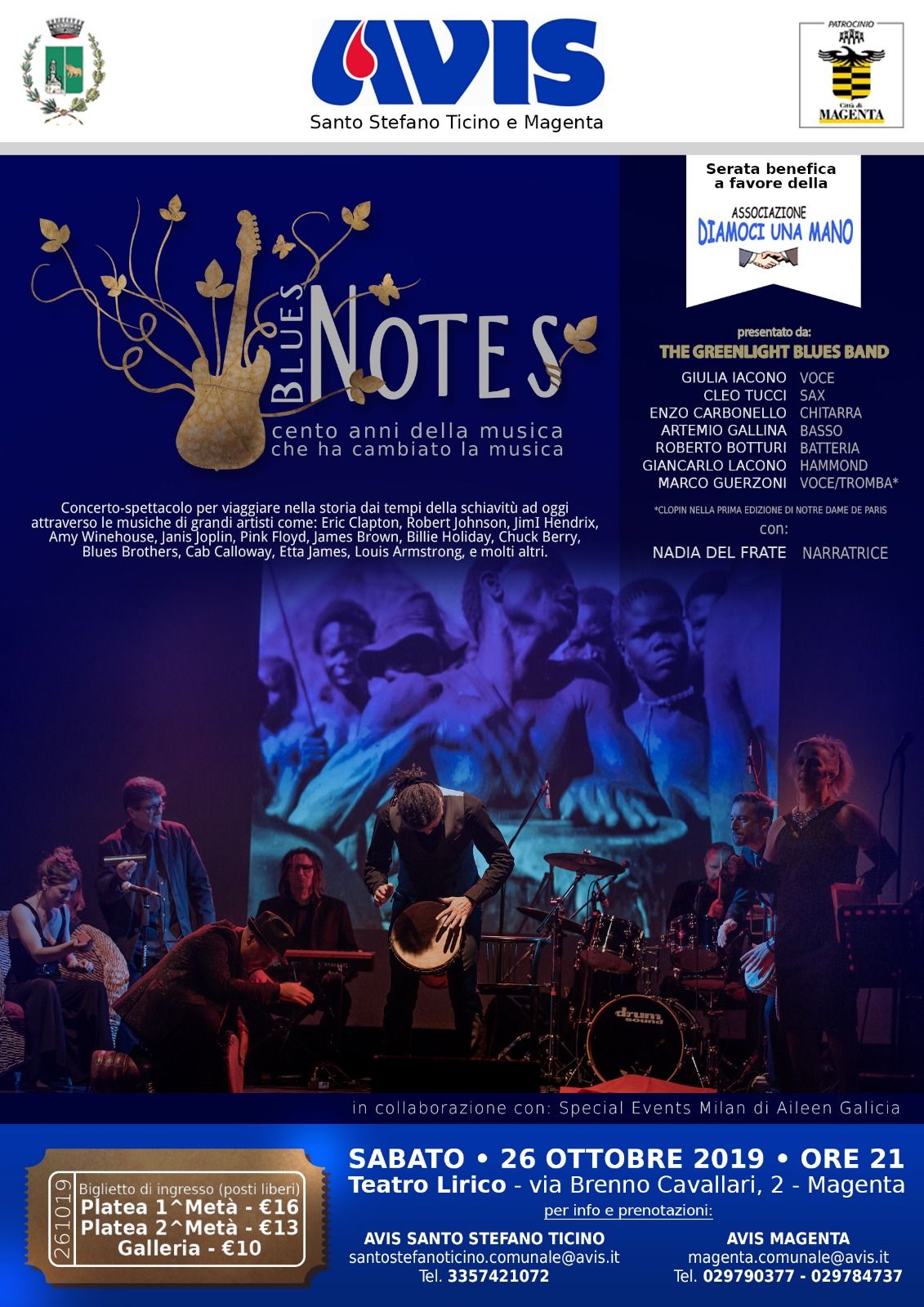 Sabato 26 ottobre alle ore 21 al Teatro Lirico di Magenta avremo la possibilità di assistere ad un bellissimo spettacolo organizzato da AVIS Santo Stefano Ticino e AVIS Magenta e interpretato dal gruppo “The greenlight blues band”.