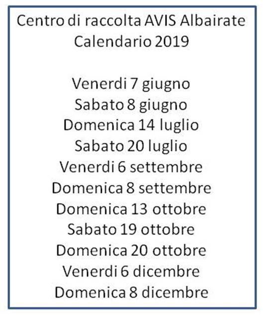Pubblichiamo il calendario delle raccolte di sangue organizzate dalla Sezione AVIS di Albairate presso la propria sede, per la gran parte nelle giornate di sabato e domenica.